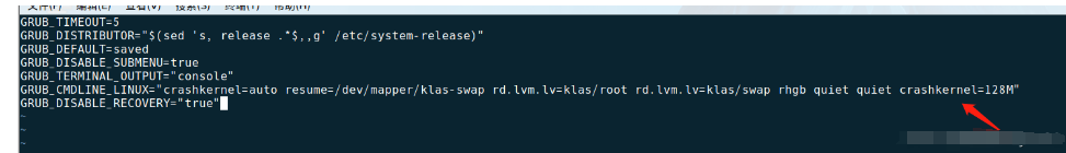 # vim /etc/default/grub //需要将GRUB_CMDLINE_LINUX="crashkernel=auto..."中的auto修改为128M。一般设为128M或256M。