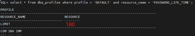 sql> select * from dba_profiles where profile = 'DEFAULT' and resource_name = 'PASSWORD_LIFE_TIME';
